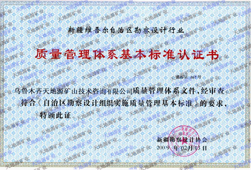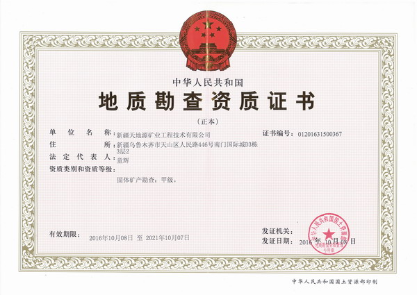 新疆天地源地勘公司成立于2004年,歷經(jīng)十余年的發(fā)展,現(xiàn)持有地質(zhì)勘查甲級(jí)資質(zhì)和ISO9001:2008質(zhì)量管理體系認(rèn)證證書(shū)。